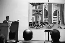 Thomas Huber is an artist who fuses image and text and lectures on his pictures. He realises his conception of the image in various mediums: paintings, aquarelle, drawings, objects, graphic arts, art within architecture, artist lectures, and artists books. For instance, his painting Rede in der Schule ("Lecture in the School") depicts the main auditorium in the Kunstakademie Düsseldorf.