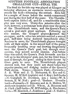 That season, the club also reached the Scottish Cup final. After two easy ties, the club struggled to a 1–0 win over Barrhead Rangers,[9] with a breakaway goal five minutes from time.[10] In the fourth round, the club hammered Possilpark F.C. by a score given as 12–0[11] or 13–0;[12] the Rutherglen Reformer noting that "they had nothing to do but score, and they did it". The club also put 12 past Rob Roy of Callander in the fifth round before meeting the 3rd Lanarkshire R.V. in a tie that Thornliebank was not expected to win. After the original tie at Deacon's Bank ended in a draw, and a hurricane-force storm prevented extra-time,[13] the replay took place at Copeland Park in Govan, the home of South Western F.C., as the Thirds' regular Cathkin Park ground was being used for Scottish FA trial matches.[14] The Thirds thought they had opened the scoring, but the goal was disallowed as they had already claimed for a foul, which was instead given; after 90 minutes, the score was 1–1, so the clubs played an extra 20 minutes. Thornliebank won the game with "a capital shot by Wham, 35 yards off". It was noted that the Thirds were unable to play their usual passing game because of the pressing of Thornliebank, so resorted to long balls, charging, and scrimmaging, which was more Thornliebank's style.[15]