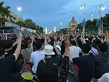 The salute first became a real-world pro-democracy symbol in the aftermath of the 2014 Thai coup d'état.[2] Due to its use, the military announced that it would arrest anyone who displayed the salute and that the symbol was made illegal in Thailand.[3] Protesters have since added symbolism to the gesture, stating that the three fingers stand for the French Revolutionary ideal of liberty, equality, fraternity.[4] The gesture was revived by protesters in the 2020 Thai political crisis.[5]