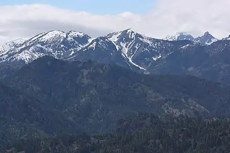 During the Pleistocene period dating back over two million years ago, glaciation advancing and retreating repeatedly scoured and shaped the landscape.[6] The last glacial retreat in the Alpine Lakes area began about 14,000 years ago and was north of the Canada–US border by 10,000 years ago.[6] The "U"-shaped cross section of the river valleys are a result of that recent glaciation. Uplift and faulting in combination with glaciation have been the dominant processes which have created the tall peaks and deep valleys of the Alpine Lakes Wilderness area.