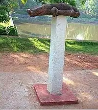 Between the pond and the eastern entrance, near a public platform for arts and discourses, is a strange granite statue. It is a man flat on his back, held up stiff and straight on a stone pillar about six feet high. Only his waist rests on the pillar, rest of the body is unsupported. He holds a shankhu (conch shell) in his left hand and wears the sacred thread indicative of the Brahmin castes. At one time the statue wore a crown as well. The idol is a stern reminder that bribery, cheating and dishonesty cannot be tolerated. Anybody who goes after these evils will be met with the capital punishment, such as, that met with the man lying on the stone. Common folklore about this stone idol has a story of jealousy, indiscretion and swift retribution.