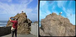 Through the Viewfinder (TtV) photography is a photographic or videographic technique in which a photograph or video or motion picture film is shot with one camera through the viewfinder of a second camera. The viewfinder thus acts as a kind of lens filter.[1][2][3] The most popular method involves using a digital camera as the image taking camera and an intact twin-lens reflex camera (TLR) or pseudo-TLR as the "viewfinder" camera.[4] TLRs typically have square waist-level viewfinders, with the viewfinder plane at 90 degrees to the image plane. The image in a TLR viewfinder is laterally reversed, i.e. it is a mirror image. Most photographers use a cardboard tube or other apparatus connecting the two cameras in order to eliminate stray light and prevent reflections from appearing on the viewfinder glass or on the lens of the imaging camera.