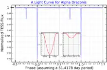 The secondary star was detected in high spatial resolution observations using the Navy Precision Optical Interferometer. The secondary star is 1.8 magnitudes (at 700 nm) fainter than the primary star and was detected at separations ranging from 6.2 to 2.6 milliarcseconds.[16] Eclipses were detected using data obtained with the Transiting Exoplanet Survey Satellite (TESS).[17] The presence of eclipses places Thuban into the class of binaries known as eclipsing binaries.[3]