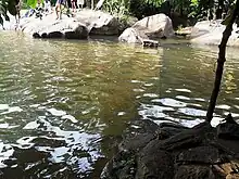 The fall, which has become a famous bathing place,[2] is situated in an estate once owned by a British and his wrecked country house can still be seen there. There is also a natural stream pool surrounded by “Ketala” plants and fern. In the nearby forest reserve, there are many migratory birds and local birds, e.g. “pale bellied flower pecker”, the smallest bird in the country.[3]