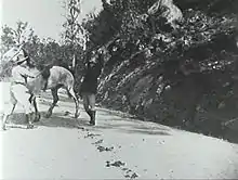 He befriends some aboriginal people, steals a racehorse, "Combo", and robs the Moonbi Mail Coach. He then enters "Combo" in a horse race and wins. He is rescued from a police trap involving Chinese by a half-caste girl, Sunday. He is grateful to her and they get married. He then holds up the Carlisle Hotel, and narrowly escapes. He takes on a boy apprentice and Sunday dies. Thunderbolt then dies in a shoot out with police on the riverbank at Uralla.[11][12]