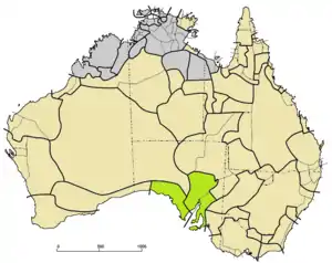 Thura-Yura languages (green) among other Pama–Nyungan (tan). The two groups are Nangga (west) and Yura–Kadli (east)