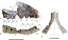Thylacinus potens ("powerful pouched dog") was the largest species of the family Thylacinidae, originally known from a single poorly preserved fossil discovered by Michael O. Woodburne in 1967 in a Late Miocene locality near Alice Springs, Northern Territory. It preceded the most recent species of thylacine by 4–6 million years,[2] and was 5% bigger,[3] was more robust and had a shorter, broader skull. Its size is estimated to be similar to that of a grey wolf; the head and body together were around 5 feet long, and its teeth were less adapted for shearing compared to those of the now-extinct thylacine.[2]