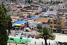 A tianguis is an open-air market or bazaar that is traditionally held on certain market days in a town or city neighborhood in Mexico and Central America. This bazaar tradition has its roots well into the pre-Hispanic period and continues in many cases essentially unchanged into the present day.[1] The word tianguis comes from tiyānquiztli or tianquiztli[2][3] in Classical Nahuatl, the language of the Aztec Empire.[4] In rural areas, many traditional types of merchandise are still sold, such as agriculture supplies and products as well as modern, mass-produced goods. In the cities, mass-produced goods are mostly sold, but the organization of tianguis events is mostly the same.[4][5] There are also specialty tianguis events for holidays such as Christmas as well as for particular types of items such as cars or art.[6][7]
