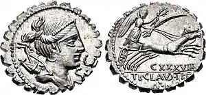 Tiberius served as triumvir of the mint (triumvir monetalis) in 79 BC. He minted denarii with a bust of Diana and a chariot driven by Victory. Some numismatists have explained the presence of Diana as an allusion to the Sabine origin of the gens Claudia, but Michael Crawford dismisses this theory, which comes from a mistake of Varro.[4]
