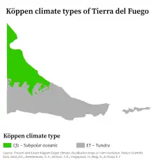 Due to its latitude, the island has a cold oceanic climate.[8] The influences from the surrounding ocean and the predominant winds from the west result in the climate being uniform throughout the province.[9] Mean annual temperatures are low, with winter temperatures averaging close to 0 °C (32 °F) and summer temperatures averaging around 10 °C (50 °F).[8][9] The strong westerly winds from the Pacific Ocean decrease the perception of the temperature (wind chill).[8] In the extreme south in the Beagle Channel which is surrounded by mountains rising above 100 m (330 ft), winds can exceed 100 km/h (62 mph).[8] The island averages around 700 mm (28 in) of precipitation per year which is fairly evenly distributed throughout the year with a slight maximum in autumn.[9] Snowfall is abundant throughout the island.[9] Much of this island can be classified as within the Magellanic subpolar forests ecoregion.[10]