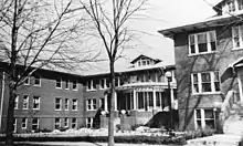 The Patient Apartments Building was the first of the five buildings to be designed and constructed specifically for the Tilden School. It was built in 1916 and is located north of the Bosler-Yankee House Administration Building at 3279 Grove Street.[42] It was designed by prominent Denver architect Harry W.J. Edbrooke.[43] The Patient Apartments Building featured fully furnished apartments where patients could reside while learning Tilden's techniques to restore health.[2] The building was designed in the Classical Revival Style and incorporated elements more commonly found in residential construction than medical facilities. The three story brick building has a hipped roof and a central circular two story portico.[14] The building in approximately 100 feet in length and the front 40 foot portion is approximately 50 feet wide with the remainder of the building approximately 48 feet in width.[27][44]