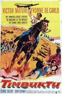 Timbuktu is a 1959 American black-and-white adventure film directed by Jacques Tourneur and starring Victor Mature and Yvonne de Carlo. It is set in Timbuktu (Africa), but was filmed in the Coral Pink Sand Dunes State Park in Kanab, Utah.[1]
