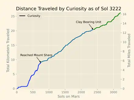 On September 11, 2014 (Sol 746), Curiosity reached the slopes of Aeolis Mons (or Mount Sharp), the rover mission's long-term prime destination[149][150] and where the rover is expected to learn more about the history of Mars.[109] Curiosity had traveled an estimated linear distance of 6.9 km (4.3 mi)[151] to the mountain slopes since leaving its "start" point in Yellowknife Bay on July 4, 2013.[151]