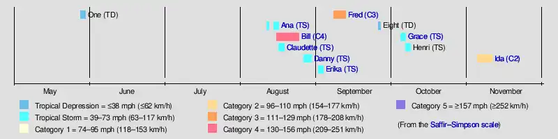 The 2009 Atlantic hurricane season was an event in the annual tropical cyclone season in the north Atlantic Ocean. It was below-average Atlantic hurricane season with nine named storms, the fewest since the 1997 season.[nb 1][2] The season officially began on June 1, 2009, and ended on November 30, 2009, dates that conventionally delimit the period of each year when most tropical cyclones develop in the Atlantic basin.[3] The first storm to form was Tropical Depression One on May 28, 2009 (one of three in 2009 that did not become a tropical storm), while the last storm, Hurricane Ida, dissipated on November 10.