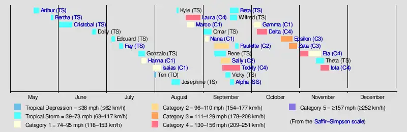 The 2020 Atlantic hurricane season was the most active Atlantic hurricane season on record in terms of number of named storms. Additionally, it was as an above-average season for tropical cyclones for the fifth consecutive year.[nb 2][2] The season officially began on June 1, 2020, and ended on November 30, 2020. These dates, adopted by convention, historically delimit the period each year when most Atlantic tropical systems form.[3] However, storm formation is possible at any time of the year, as was the case this season, when its first two named storms, Tropical Storm Arthur and Tropical Storm Bertha, formed on May 16 and May 27, respectively. The final storm, Hurricane Iota, dissipated on November 18.