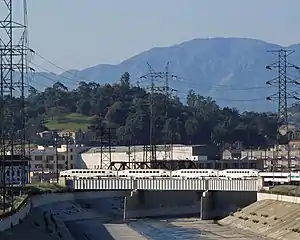 Los Angeles River today, looking north in the area where Portolá crossed. The green hill in the mid-distance is Elysian Park, where California Historical Landmark#655 ("Portolá Trail Campsite") has been placed while the actual campsite is located on the other side of the river. - 2 – West out of San Gabriel Valley, through the hills to the river Crespí named El Río de Nuestra Señora La Reina de Los Ángeles de Porciúncula. Crespí also noted the dry riverbed (Arroyo Seco) entering just above the spot where they crossed.