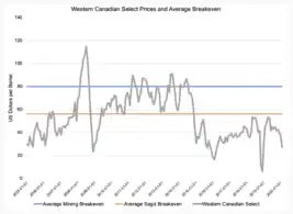 Graph outlining oil prices and breakevens for different extraction. methods used in Alberta.