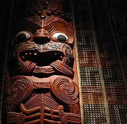 When her child Tūhuruhuru is born, the ritual birth ceremony is performed by Kae, a priest.[1] After this is done, Tinirau lends Kae his pet whale to take him home. In spite of strict instructions to the contrary, Kae forces the whale, Tutu-nui, into shallow water, where it dies, and is roasted and eaten by Kae and his people. When he learns of this Tinirau is furious and sends Hinauri with a party of women (often they are Tinirau's sisters) to capture Kae, who is to be identified by his overlapping front teeth. The sisters perform indecent dances to make him laugh.[2] When he laughs, they see his crooked teeth. Then the women sing a magic song which puts Kae into a deep sleep, and carry him back to Motutapu. When Kae wakes from his sleep he is in Tinirau's house. Tinirau taunts him for his treachery, and kills him (Grey 1970:69, Tregear 1891:110, Biggs 1966:450).