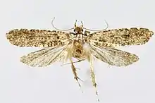 The wingspan is about 20 mm for males. The forewings are yellowish brown mixed with grayish brown, shining bluish violet, with scattered faint white dots, large and conspicuous at the base, along the costa, termen and dorsum. The hindwings are grayish brown, shining bluish violet.