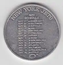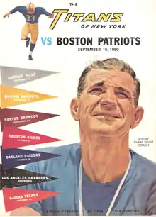 Baugh invited some 100 players to the Titans' first training camp, which opened at the University of New Hampshire on July 9, 1960.[13] As NFL teams cut players from their training camps, many were invited to the Titans' or other AFL teams' training camps as the teams sought to fill their 35-man rosters.[14] The franchise's first preseason game took place on August 6, 1960, against the Los Angeles Chargers at Los Angeles Memorial Coliseum. The Titans kicked off to begin the game, and Chargers running back Paul Lowe returned the kick 105 yards for a touchdown. New York lost, 27–7.[15] On September 11, 1960, the opening regular season game was played in a heavy downpour, the remains of Hurricane Donna. Water poured off Coogan's Bluff, situated above the Polo Grounds, swamping the field, which had poor drainage. The Titans' offense was less affected by the mud than that of the visiting Buffalo Bills. The Titans won the game 27–3 before a crowd of 9,607 (5,727 paid attendance).[16] The following week New York played another home game, against the Boston Patriots. On the first of many occasions when the team would lose a game after taking a big lead, the Titans were ahead 24–7 in the second half. With the lead reduced to 24–21, the Titans punted from deep in their own territory with seconds left. The punter, Rick Sapienza, fumbled the snap, and the Patriots recovered in the end zone for the victory.[17] The following week, with the Titans playing at the Denver Broncos, New York blocked a punt on the final play to win the game.[18] In their fourth game, New York had a two-point lead when it fumbled with fifteen seconds left against the Dallas Texans. This set off a scramble for the ball, which the Titans recovered as time ran out. Viewers in New York were spared the harrowing ending; in a prelude to the Heidi Game eight years later, the local ABC station had switched to a Walt Disney Davey Crockett special at 6:30 p.m. Many viewers called to complain.[19]