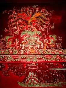Tlālōcān is also the first level of the upper worlds, or the Aztecs' Thirteen Heavens, that has four compartments according to the mythic cosmographies of the Nahuatl-speaking peoples of pre-Columbian central Mexico, noted particularly in Conquest-era accounts of Aztec mythology. To the Aztec there were thirteen levels of the Upper Worlds, and nine of the Underworld; in the conception of the Afterlife the manner of a person's death determined which of these layers would be their destination after dying. As the place of Tlālōc, 9th Lord of the Night,[2] Tlālōcān was also reckoned as the 9th level of the Underworld, which in the interpretation by Eduard Seler was the uppermost underworld in the east.[3]