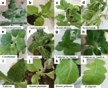 The foliage of affected tomato plants shows mottling, with alternating yellowish and darker green areas, the latter often appearing thicker and raised giving a blister-like appearance. The leaves tend to be fern-like in appearance with pointed tips and younger leaves may be twisted. The fruit may be distorted, yellow blotches and necrotic spots may occur on both ripe and green fruit and there may be internal browning of the fruit wall. In young plants, the infection reduces the set of fruit and may cause distortions and blemishes. The entire plant may be dwarfed and the flowers discoloured.[1] Environmental conditions influence the symptoms. These include temperature, day length and light intensity as well as the variety, the age of the plant at infection and the virulence of the strain of ToMV.[2]