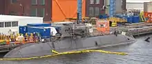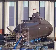 The Type 212A is a class of diesel-electric submarine developed by Howaldtswerke-Deutsche Werft AG (HDW) for the German Navy (German: U-Boot-Klasse 212 A), and the Italian Navy where it is known as the Todaro class.[7] It features diesel propulsion and an additional air-independent propulsion (AIP) system using Siemens proton-exchange membrane (PEM) compressed hydrogen fuel cells. The submarines can operate at high speed on diesel power or switch to the AIP system for silent slow cruising, staying submerged for up to three weeks with little exhaust heat. The system is also said to be vibration-free and virtually undetectable.