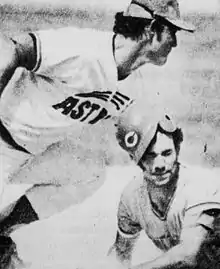 ![]() Spencer (right) sliding into third base safely in 1975. | |