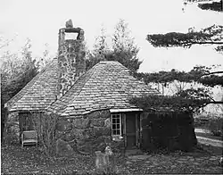 The building was built in 1929 to a design by New York City architect Alfredo S.G. Taylor. Taylor spent many summers in Norfolk, and is credited with more than thirty commissions in the community. A number of them share the medieval features used in this building: the rough rustic stone and wood finishes, and heavy slate roof. Details of the building were published in American Architect and Building News after its construction. Taylor's work for the Childs family also included the Starling Childs Camp on Doolittle Lake, and the Childs Sports Building; the latter in particular, located north of Windrow Road, has similar style and construction methods to this building, but on a larger scale.[2][3] This house was referred to by the family as the "Teahouse"; its "Tom Thumb" name was applied in the American Architect and Building News article.[2]