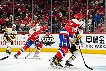 The 2020–21 NHL season brought more controversy for Wilson's playing style, beginning with a "very big, and very late" hit on Mark Jankowski of the Penguins at the end of February.[72] This was followed by a hit on Brandon Carlo of the Boston Bruins on March 5, which resulted in Carlo being transported to the hospital in an ambulance. Bruins coach Bruce Cassidy referred to the incident as a "predatory hit from a player who's done that before", while Carlo's teammate Brad Marchand referred to it as a "bullshit hit".[73] Although referees did not call an on-ice penalty for the hit, the Department of Player Safety later suspended Wilson for seven games, requiring him to forfeit over $300,000 of his salary to the NHL Players' Emergency Assistance Fund.[74] On May 4, the NHL and Department of Player Safety came under fire when they chose not to suspend Wilson for a fight against New York Rangers skaters Pavel Buchnevich and Artemi Panarin. Wilson first hit Buchnevich before removing Panarin's helmet and throwing him into the ice. Panarin was forced to miss the remainder of the season, while the Rangers released a statement declaring George Parros, the head of the Department of Player Safety, "unfit to continue in his current role".[75] The controversy was amplified when, the following day, Shayne Gostisbehere of the Flyers was suspended two games for a hit against Mark Friedman of the Penguins. Unlike Wilson, Gostisbehere had never before received an NHL suspension.[76] On May 7, 2021, Wilson told reporters that he had reached out to Panarin and that he wished to move on from the incident.[77] After scoring 13 goals and 20 assists during the regular season,[78] Wilson opened the scoring for the 2021 Stanley Cup playoffs with a shot against Tuukka Rask of the Bruins.[79] That goal would be the only even-strength point drawn from one of the Capitals' top-six forwards as they fell to the Bruins in five games.[80]