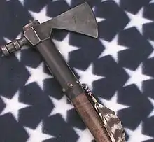 A tomahawk is a type of single-handed axe used by the many Indigenous peoples and nations of North America. It traditionally resembles a hatchet with a straight shaft.[1][2] In pre-colonial times the head was made of stone, bone, or antler, and European settlers later introduced heads of iron and steel. The term came into the English language in the 17th century as an adaptation of the Powhatan (Virginian Algonquian) word.