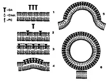 The membrane disruptive properties of tomatine are caused by the ability to form 1:1 complexes with cholesterol. A possible mechanism of the membrane disruption by glycoalkaloids is displayed in figure 2. First, the aglycon part of tomatine binds reversibly to sterols in the membrane (figure 2, part 2). When this reaches a certain density, the glycosidic residues of the glycoalkaloids interact with each other by electrostatic interactions. This interaction catalyzes the development of an irreversible matrix of glycoalkaloid-sterol complexes (figure 2, part 4). In this way, the sterols from the external membrane are immobilized and membrane budding will arise. Tubular structures are formed, because of the structure of tomatine (figure 2, part 6).[14][17] This membrane disruption causes cell death by cell leakage.[14] Also, the disrupted membrane has an influence on sodium transport, by altering the membrane potential and reducing active sodium transport. When tomatine is orally ingested, the brush border of the intestine is damaged by the membrane-disruptive properties of tomatine, so increased uptake of macromolecules occurs. This damage to the epithelial barriers is dose-dependent.[14][17]