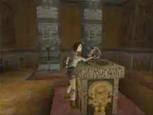 Lara has two basic stances: one with weapons drawn and one with her hands-free. When her weapons are drawn, she automatically locks on to any nearby targets. Locking onto nearby targets prevents her from performing other actions which require her hands, such as grabbing onto ledges to prevent falling. By default, she carries two pistols with infinite ammo.[12] Additional weapons include a shotgun, dual magnums, and dual Uzis.[11] A general action button is used to perform a wide range of movements, such as picking up items, pulling switches, firing guns, pushing or pulling blocks, and grabbing onto ledges. Items to pick up include ammo, small and large medi-packs, keys, and artefacts required to complete a stage. Any item that is collected is held onto in Lara's inventory until it is used.[14] Throughout each stage, one or more secrets may be located. Discovering these secrets is optional, and when the player finds one a tune plays. The locations of these secrets vary in difficulty to reach. The player is usually rewarded with extra items.[11]
