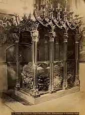 The tomb is a late Gothic masterpiece made from mainly red marble from Adnet, near Salzburg.[6] It is composed of a sarcophagus, over which was sculpted a canopy supported by ornate arches.[9] The inner parts of the canopy are made from limestone from Pińczów. A full length sculpted effigy of Casimir lies on top of the sarcophagus. The effigy is highly unusual: Casimir is presented as being in agony and is dressed in a clerical cloak only used at coronations. Stoss's signature appears under the effigy's feet.[6] The sides of the sarchophagus bear the arms of Casimir's kingdoms and territories. The canopy includes a late Gothic crown. The nature of the sculpting of the crown and arches echoes the ornate carving of wooden altarpieces at the time. The arches are supported by marble pillars, the capitals of which feature biblical scenes and are signed by Stoss's assistant, Jörg Huber of Passau.[9]