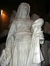 The monument consists of a rectangular sarcophagus 3.90 m long, 2.33 m wide, and 1.27 m tall.[1] The gisants (recumbent effigies) of the deceased couple are lying prostrate with hands raised in prayer. Their heads rest on thick pillows held up by three angels. Margaret's feet are on a greyhound, a symbol of fidelity; Francis's feet rest on a lion, representing strength. At the four corners of the tomb stand four statues, each representing one of the cardinal virtues: Courage, Justice, Temperance and Prudence.