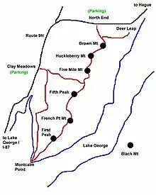 The Tongue Mountain Range Trails are a series of hiking trails located within the Tongue Mountain Range, a subordinate range within the Adirondack Mountains of New York. The trails, 25 miles (40 km) in total length, vary from easy walks along the foot of the mountains on the shore of adjacent Lake George, to more rugged ascents of mountain peaks within the range.[1]
