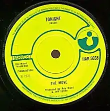 "Tonight" is a song recorded by The Move and was written by Roy Wood originally for pop vocal group The New Seekers. Released in 1971, The Move's version was their first single release on the Harvest label, and charted at number 11 on the UK Singles Chart.[1] In Denmark, it charted at number seven.[2] The song peaked at number 89 in Australia.[3]
