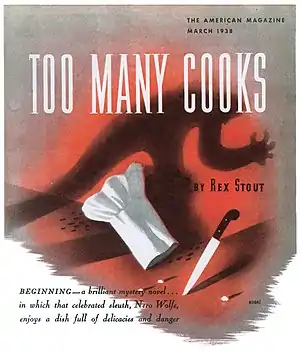 - ↑ The title page of the series in The American Magazine was also used as a pictorial wrapper for a boxed set of recipes for the dishes mentioned in Too Many Cooks. Readers were invited to write Nero Wolfe at the magazine and enclose a three-cent stamp (p. 137). Of the 35 recipes in the story, 12 were created by Rex Stout, "who, like his famous Nero, always has a culinary idea brewing," the magazine reported (p. 82).