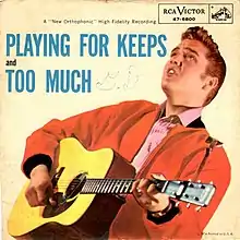 "Too Much" is a #1 song most notably recorded in a hit version by Elvis Presley and published by Elvis Presley Music in 1956. It was written by Bernard Weinman and Lee Rosenberg.[1][2][3][4][5] It was first released in 1955 by Bernard Hardison on Republic Records. Presley recorded the song in September 1956 and first performed it on January 6, 1957, on CBS-TV's The Ed Sullivan Show. Released as a single, Presley's "Too Much" reached number one on both the Cashbox and Billboard sales charts and went to number three on the R&B chart.[6] The single peaked at number two on the then-named Top 100 chart, the main Billboard pop chart.[7][8]