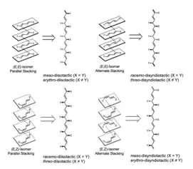 Tactic and stereoselective polymerizations are traditionally catalyzed by metal-organic complexes. Topochemical polymerization provides an additional choice. In addition, by changing the alignment of the monomer within the crystal, the tacticity/stereochemistry of the polymer product could be easily controlled. An intuitive example is shown in the figure. In topochemical polymerization of 1,3-diene carboxylic acid derivatives, polymers with four different configurations can be prepared. Their structural relationships with the monomer packing are also shown in the figure.[25]