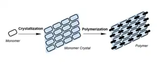 Topochemical polymerization is a polymerization method performed by monomers aligned in the crystal state. In this process, the monomers are crystallised and polymerised under external stimuli such as heat, light, or pressure. Compared to traditional polymerisation, the movement of monomers was confined by the crystal lattice in topochemical polymerisation, giving rise to polymers with high crystallinity, tacticity, and purity.[1] Topochemical polymerisation can also be used to synthesise unique polymers such as polydiacetylene[2] that are otherwise hard to prepare.