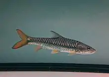 Tor putitora, the Putitor mahseer, Himalayan mahseer, or golden mahseer, is an endangered species of cyprinid fish that is found in rapid streams, riverine pools, and lakes in the Himalayan region. Its native range is within the basins of the Indus, Ganges and Brahmaputra rivers.[1] It was reported to be found in the Salween river, the natural border between Thailand and Myanmar as well, but the number is very rare, only three times in 28 years.[2]