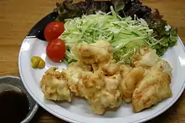 Toriten is a Japanese tempura style fried chicken. It originated food in Ōita Prefecture, and is very popular there. Any part of the chicken can be used. The meat is cut into small pieces, dipped in soy sauce, sake and garlic powder, rolled in tempura powder and deep fried. Toriten is commonly served with fresh greens, and eaten hot immediately after frying. The most common sauce is Ponzu sauce (made with soy sauce and vinegar) with mustard. In Oita, it is also popular to eat with a Kabosu-based sauce.