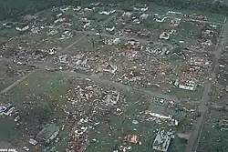 Shortly after 7:30 p.m. on April 8, the outbreak's deadliest tornado cut a 31-mile-long (50 km), 3⁄4-mile-wide (1.2 km) swath through multiple Birmingham suburbs, producing damage ranging from F3 to F5 and causing massive destruction before lifting in the western limits of the City of Birmingham, just northwest of the junctions of Interstates 20, 59 and 65. The worst of the destruction occurred across the cities of Oak Grove, Rock Creek, and McDonald Chapel. The second area affected by F5 damage was also devastated by a violent tornado in 1956 that tracked through the same areas hit by this storm. Debris from the tornado was scattered across central Alabama as far north as sections of Blount County, and extensive deforestation occurred along the majority of the path.[4][5]