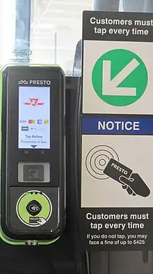 The TTC supports three types of Presto fare media: the Presto card, Presto ticket and open payment methods by contactless credit and debit cards. All of these process fares and transfers by means of tapping the Presto media on Presto readers, which are located on buses, on streetcars, and at subway entrances.[3]