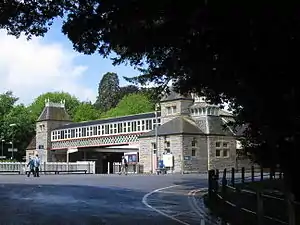 The station has two ranges of buildings, each 244 feet (74 m) long, built in local grey rubble stone on either platform. Deep canopies on composite iron and wood girders cover the platforms; there are further canopies on the road side of both buildings. the building which faces the sea at Abbey Sands and the town is used and this houses the ticket office and a café; the gate from this approach road is open when trains are running.[4] The one remaining signal box (now rented out for commercial purposes) is situated at the south end of this platform near a decorative cast iron bridge across the tracks. The station buildings are Grade II listed.[1]
