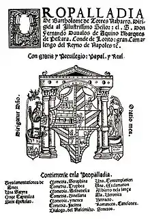 After some years of soldiering and of captivity in Algiers, Torres Naharro took holy orders, settled in Rome about 1511, and there devoted himself chiefly to writing plays. Though he alludes to the future pope, Clement VII, as his protector, he left Rome to enter the household of Fabrizio Colonna at Naples as a chaplain[3] where his works were printed under the title of Propaladia (1517). He is conjectured to have returned to his native place, and to have died there shortly after 1529.[4]