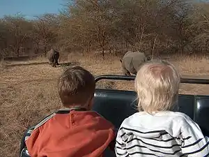 Western tourists visit rhinoceroses kept at the Bandia Natural Reserve near Dakar.