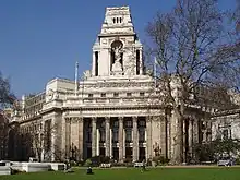 Lutyens described the RFAC's opinion as "bosh", and suggested to Ware that they should continue regardless and force a confrontation. Ware was more diplomatic, and the IWGC chose a new site in Trinity Square Gardens on Tower Hill, still west of Tower Bridge but further from the river.[1][9][10][11] This site was considered appropriate because it was within sight of the Thames, albeit not on the riverbank, and the area already had maritime connections, including the headquarters of the Port of London Authority at 10 Trinity Square, Trinity House, and the church of All Hallows-by-the-Tower (itself home to many nautically themed memorials).[1][12] Philip Longworth, in a history of the IWGC, remarked that the location meant the commission's only memorial in London "would never be seen by most Londoners, still less find a place in the national consciousness as did Lutyens' stark monument on Whitehall". (The Cenotaph was not commissioned by the IWGC.)[13]
