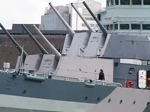 The Edinburgh class were longer at 614 ft (187 m) compared to 592 ft (180 m), initially to allow an increase in the main armament from twelve 6 in (152 mm) guns in four triple turrets as in the two previous sub-classes, to sixteen 6 in guns in four quadruple turrets. The idea was soon shelved however due to the difficulties in actually manufacturing an effective quadruple 6 in turret and so the class reverted to the original main armament design, although improved through a "long trunk" Mk XXIII turret design, which reduced the crew requirements and increased the speed of the ammunition hoists.[9] Four extra 4 in (102 mm) "High Angle Low Angle" guns and eight extra 2-pounder (40 mm) guns and further armour protection were added instead.